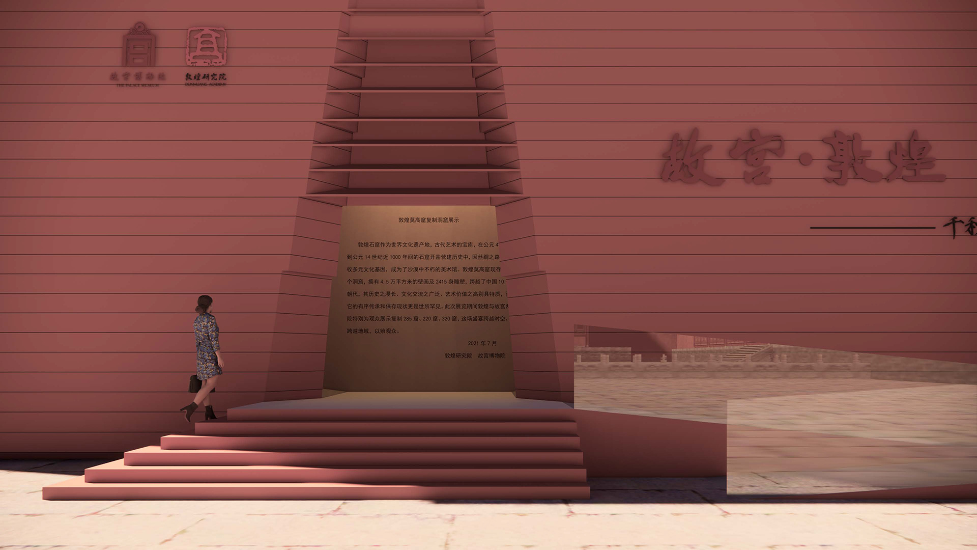 通过故宫红的外观,整个展厅得以顺利融入故宫的环境,而内部则以灯光和数字设计形态的变化,产生了沙丘隔壁的空间意向,完成从故宫到敦煌的体验印象转换。